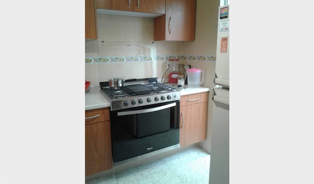 Cocina equipada con refrigerador, estufa, microondas y espacio en alacena.