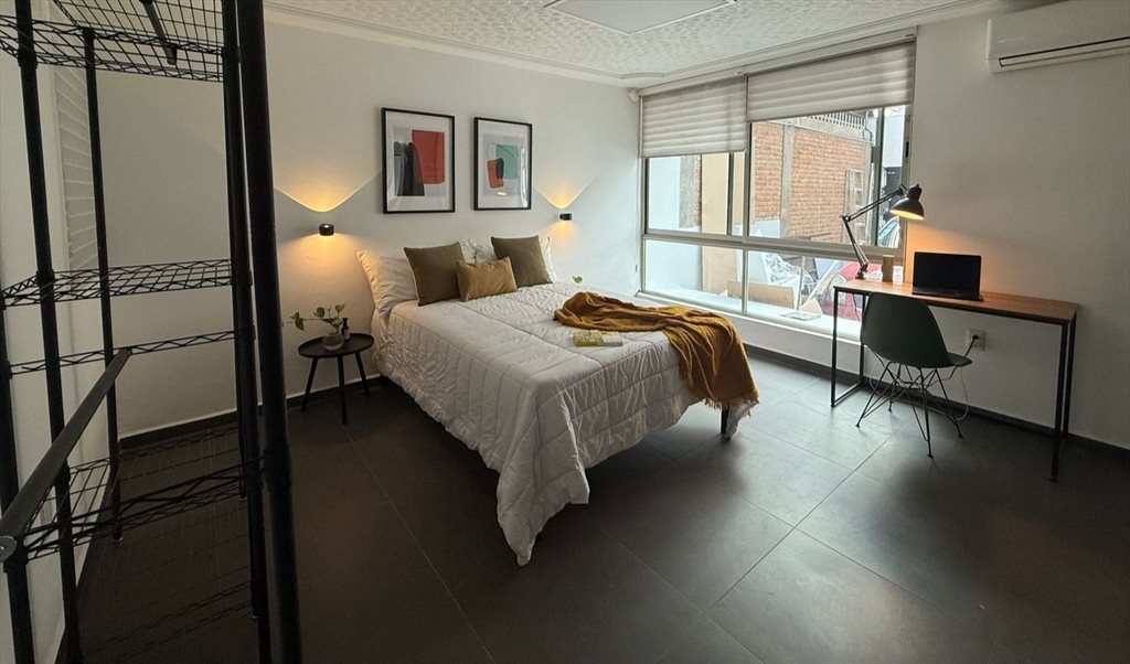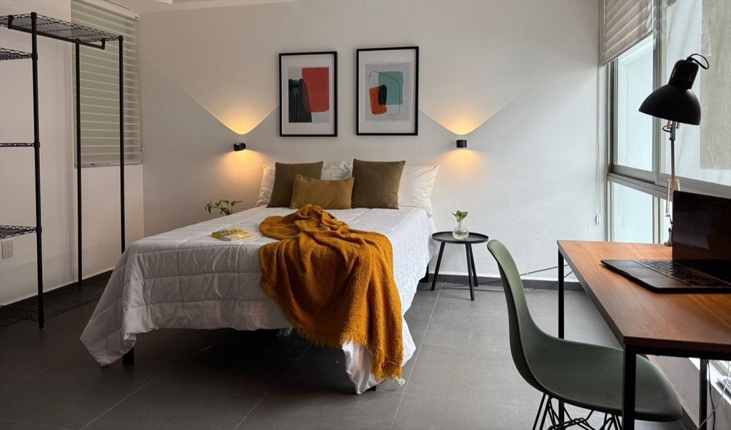 Habitación privada completamente amueblada en un coliving, con áreas comunes y ambiente tranquilo.